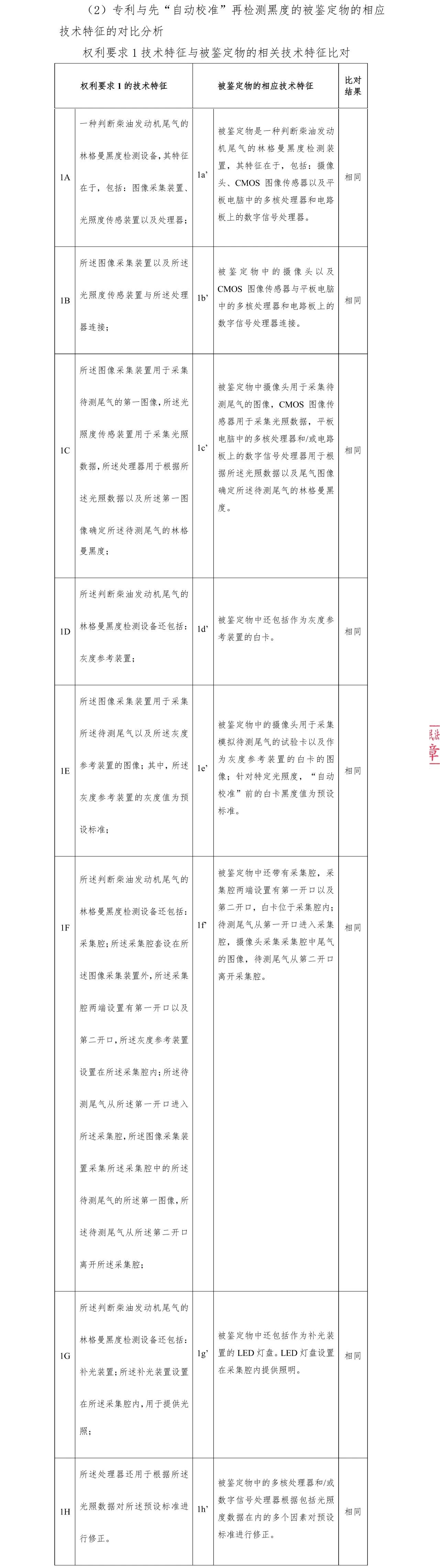 對此,庭審過程中各方都選擇了國家工業(yè)信息安全發(fā)展研究中心作為鑒定機構(gòu),對被告火眼公司的相關(guān)產(chǎn)品進行鑒定。下圖為鑒定機構(gòu)出具的本專利權(quán)利要求1技術(shù)特征與被鑒定物的相關(guān)技術(shù)特征比對的一部分結(jié)果,從中可以看出所有比對項的技術(shù)特征都相同。