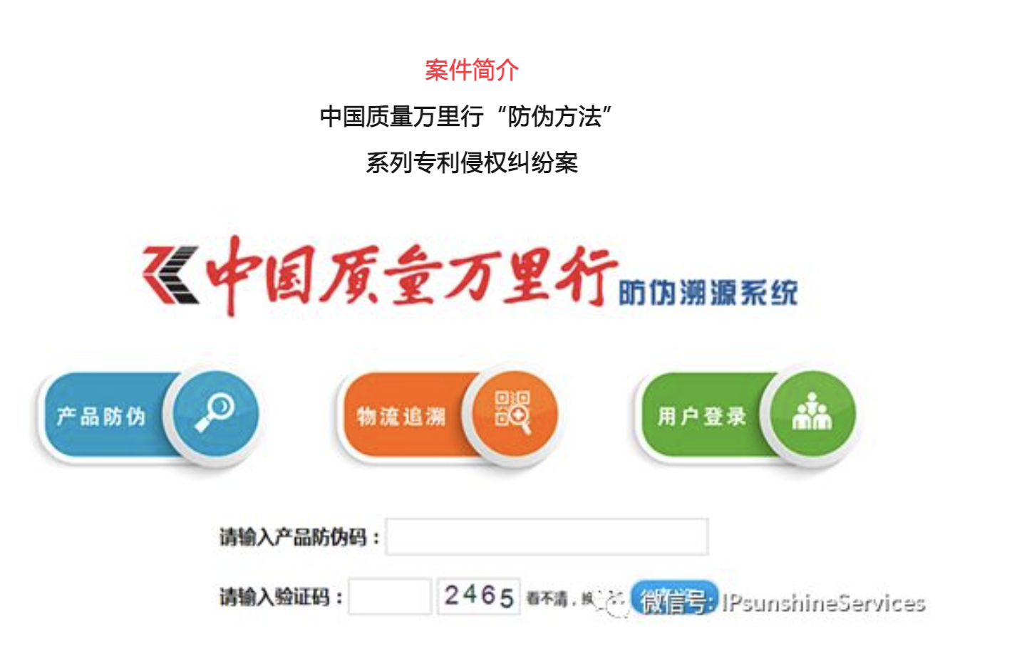 2016年下半年,北京金源茂豐新技術開發(fā)有限公司認為《中國質(zhì)量萬里行》雜志社和四川巨人好兒郎酒業(yè)有限公司涉嫌侵犯其“產(chǎn)品質(zhì)量追溯防偽系統(tǒng)及追溯防偽方法”等三件專利權,委托三聚陽光向北京市知識產(chǎn)權局提出專利侵權糾紛處理請求。