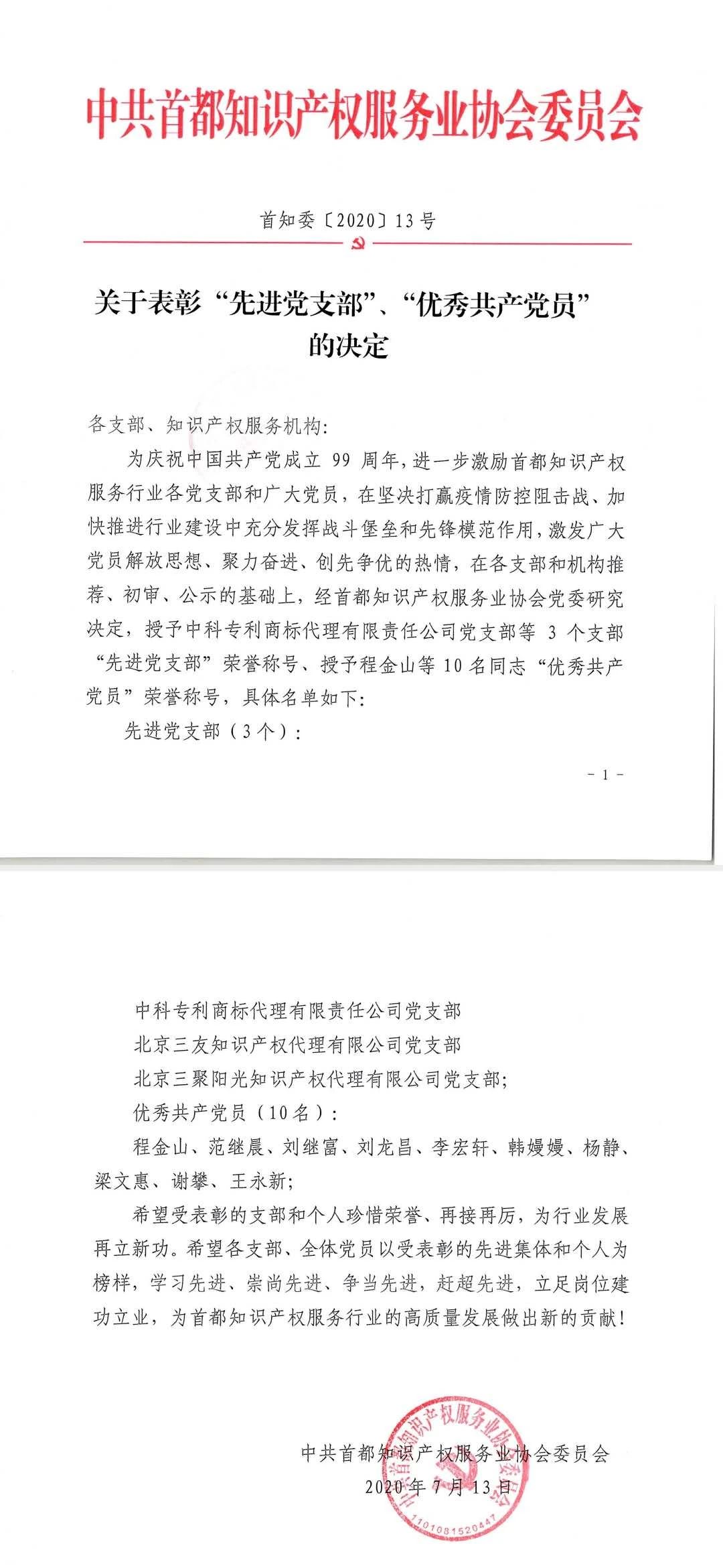 近日,首都知識產(chǎn)權(quán)服務(wù)業(yè)協(xié)會黨委下發(fā)表彰決定,授予北京三聚陽光知識產(chǎn)權(quán)代理有限公司黨支部“先進(jìn)黨支部”榮譽(yù)稱號,以表彰三聚陽光黨支部在支部成立以來,在支部建設(shè)、服務(wù)客戶等方面的突出成績,特別表彰疫情防控阻擊戰(zhàn)打響以來,帶領(lǐng)公司員工做好疫情防控同時(shí)開展知識產(chǎn)權(quán)服務(wù)的突出表現(xiàn)。