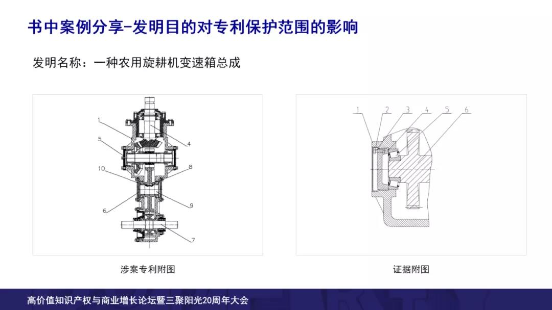 涉案專利要求保護一種農(nóng)用旋耕機的變速箱總成,雙方焦點權利要求的技術特征,“三軸壓蓋位于箱體殼兩側”,請求人認為因為專利中沒有記載是在兩內側還是外側,所以權利要求的保護范圍應該包括內側和外側,而其認為證據(jù)中公開了兩內側的技術方案,所以證據(jù)中公開了上述特征,而專利權人并不這樣認為。專利權人認為根據(jù)專利的發(fā)明目的,它的背景技術明確記載了解決的技術問題就是針對和現(xiàn)在的證據(jù)一樣的三軸壓蓋位于箱體殼內側的技術方案。